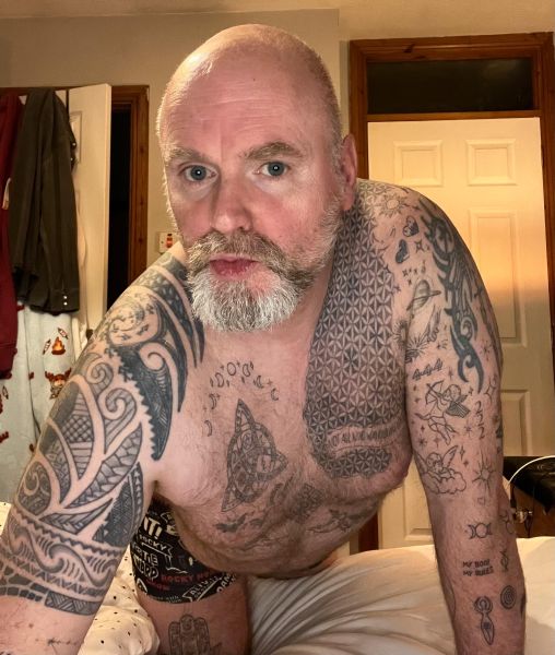Tattooed & pierced, Viking style beard, with a dad bod.