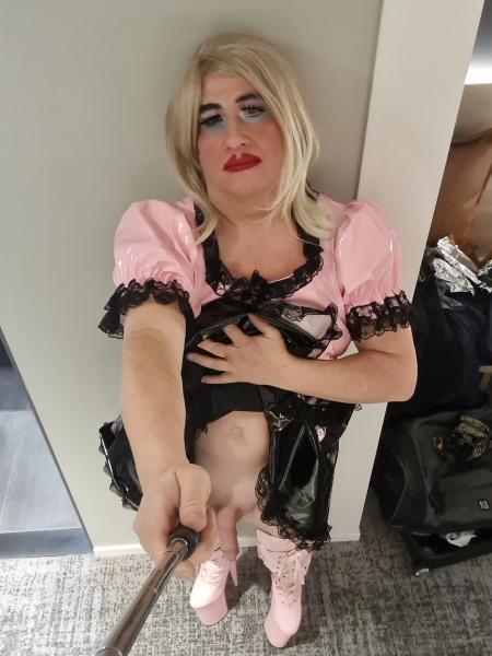 I love fetish, particularly pink PVC maid, Pink Poofy silky Sissy with open backed satin panties for easy entry, enormous red and pink please me boots with 10" heels.